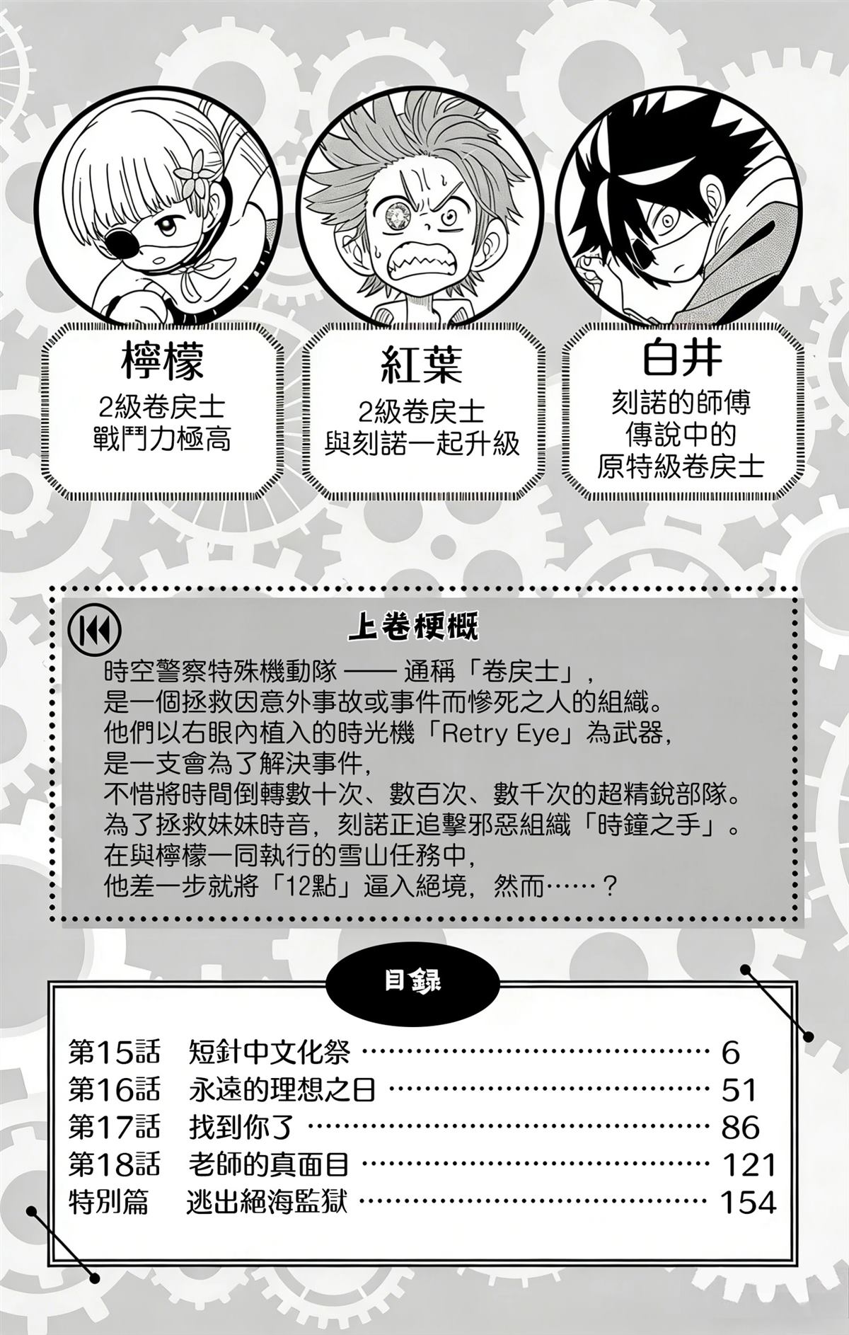 《运命の巻戻士》故事主要设定里的部门时空警察特殊机动队,通称巻戻士(makimodoshi),是一支为了拯救在悲运中不幸死去的人们不断的使用时间机器【Retry·Eye】回到过去解决事件的超精锐部队。男主クロノ为了拯救意外去世的妹妹トキネ而不断成长冒险的故事……